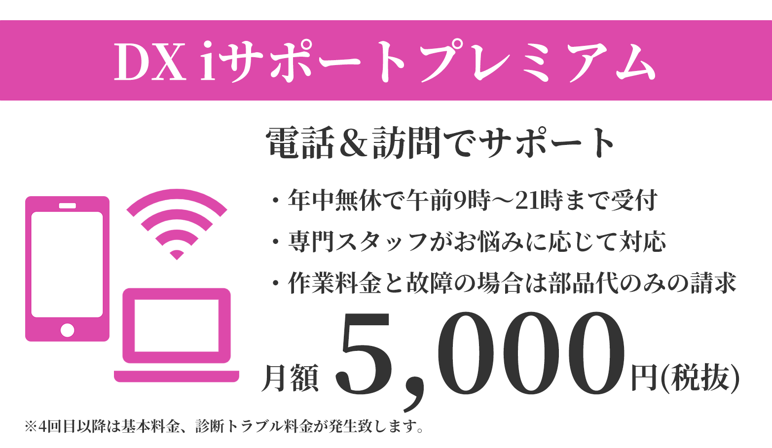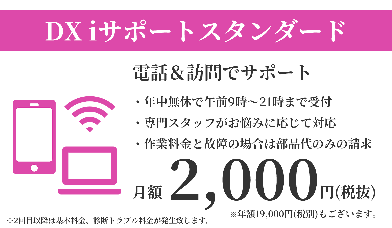 ■i'サポート(スタンダード、プレミアム):訪問サポートのサポート範囲・作業料金については約款、i'サポート(ライト・スタンダード・プレミアム)のメニュー表をご確認下さい。